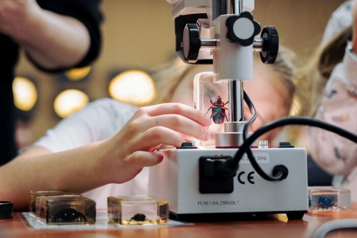 В начале занятия ведущий вместе с детьми вспоминает, кто такие насекомые, их основные признаки и конкретных представителей – жуков. Участникам расскажут о самых «выдающихся» жуках, приведут интересные факты, сопровождая рассказ красочной презентацией, а также предложат познакомиться с коллекцией современных жуков, законсервированных в синтетической смоле. Ведущий объяснит, как устроен бинокулярный микроскоп, как им пользоваться.